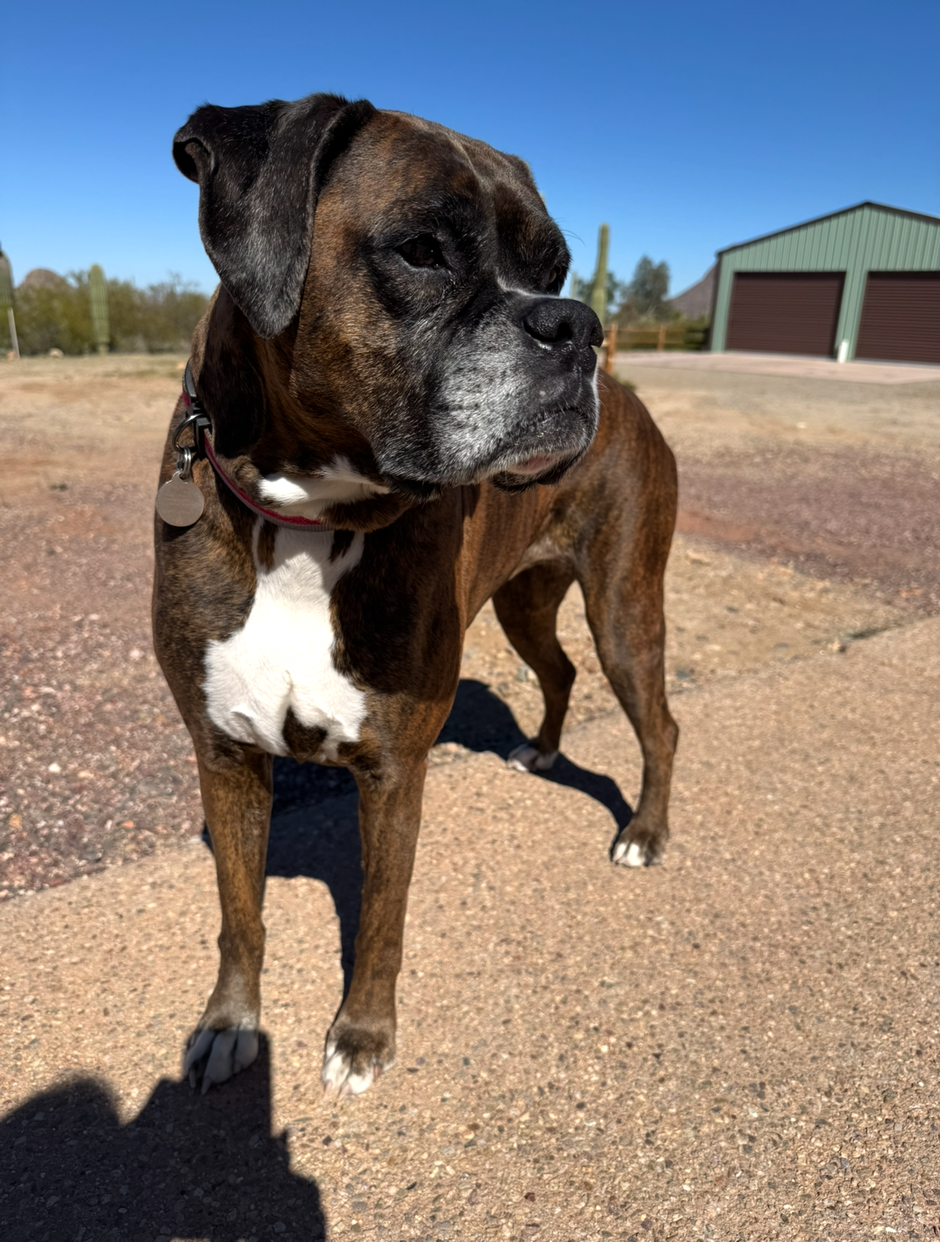 Shadow is ready to be your TV partner. She is a big teddy bear. She is 5 1\2, spayed, up to date on shots, micro chipped and is reg. CKC 100% boxer, does not come with papers. She had blood work done when spayed and it was perfect! She has a gruff appearance being on the bigger side 68 lbs but is a sweetheart, She loves going on car rides getting sprayed with the hose and company of other dogs and kids. She is one of my calmest girls, house trained doggie door trained, very well mannered. She gets along with everyone her sister will be getting retired next yr. Shadow will be ready next weekend to give her time to heal from surgery. Shadow has found a forever home with Raichelle and Shadow's daughter in Tucson!
